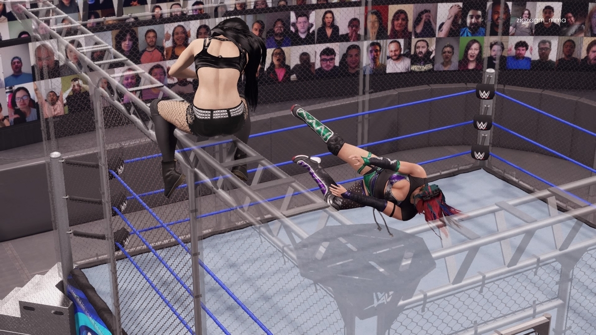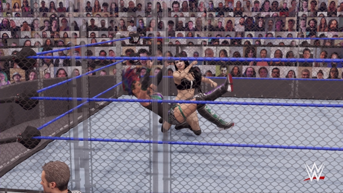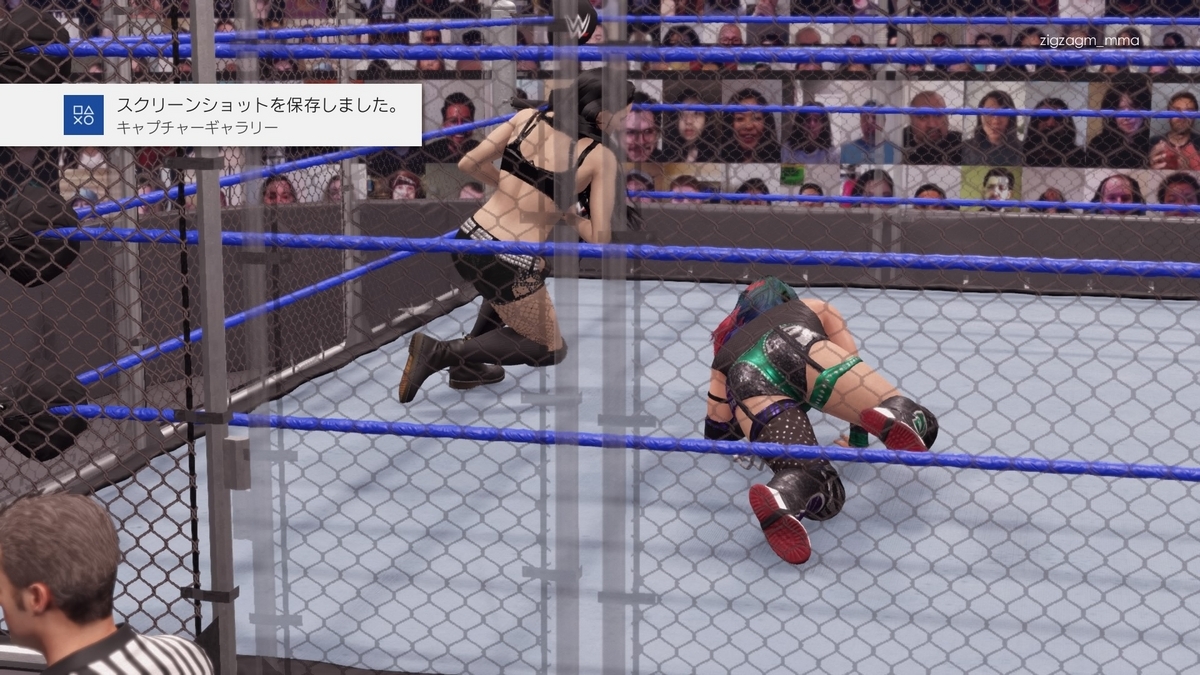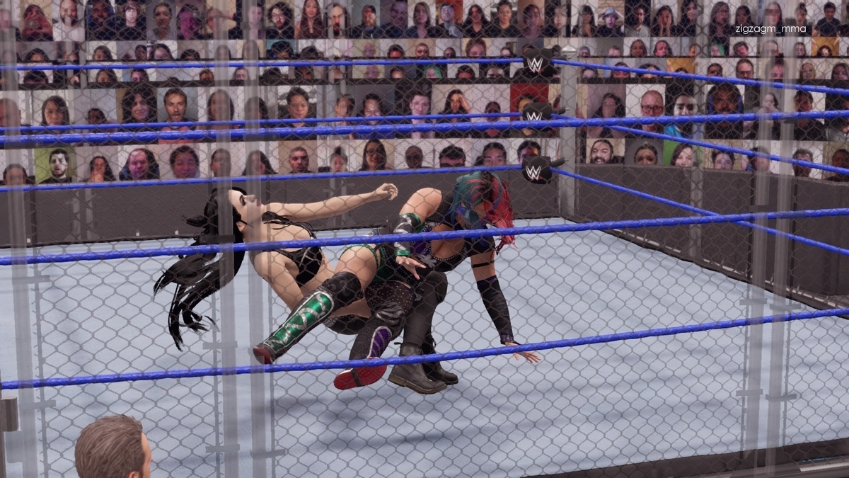 ※アスカも反撃を試みるもペイジがいなしていく!だが、勢いのまま金網へぶつかってしまうペイジ!